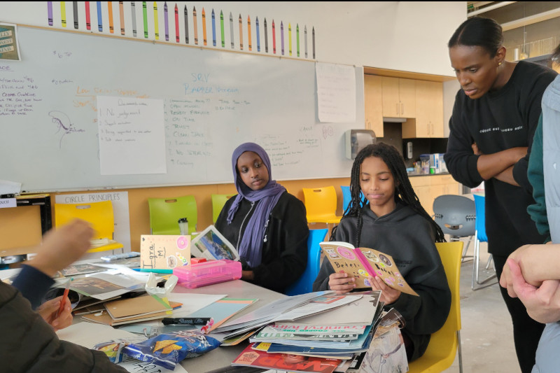 Our Book Circles emphasize relationship building and are guided by the interests of girls and nonbinary youth. Their lived experiences are at the heart of our curricula, which shape their book selections and artwork projects.